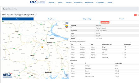 MALATYA. (DHA) - MALATYA'DA, Richter ölçeğine göre 4.3 büyüklüğünde deprem meydana geldi.Afet ve Acil Durum Yönetimi Başkanlığı'nın (AFAD) verilerine göre; saat 12.54’te merkez üssü Malatya’nın Yeşilyurt ilçesi olan 4.3 büyüklüğünde deprem meydana geldi. 14,27 kilometre derinlikte kaydedilen depremde ilk belirlemelere göre, herhangi bir olumsuzluk yaşanmadı. (DHA)