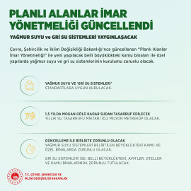 ANKARA, (DHA)- RESMİ Gazete'de yayımlanan düzenlemeyle . Güncellemeyle belli büyüklük ve tipteki kamu binaları ve özel binalarda yağmur suyu ve gri su sistemlerinin kurulumu zorunlu olacak. Bu sayede 1,5 yılda Mogan Gölü kadar sudan tasarruf edilmesi hedefleniyor.Çevre, Şehircilik ve İklim Değişikliği Bakanlığı'ndan yapılan açıklamaya göre, Mesleki Hizmetler Genel Müdürlüğü tarafından hazırlanan 'Planlı Alanlar İmar Yönetmeliği'nde değişiklik yapıldı. Resmi Gazete'de yayımlanarak yürürlüğe giren yönetmelikle, binalarda yağmur suyu ve gri su kullanımından 'Yeşil Sertifika'ya, elektrikli araçlar için kurulacak şarj ünitelerinden engelsiz çocuk oyun alanlarına kadar pek çok başlıkta düzenleme yapıldı. Yönetmelikte 1 Ocak 2026'dan sonra yapılacak belli büyüklük ve tipteki özel ve kamu binalarında yağmur suyu ve gri su sistemlerinin kurulumu zorunlu olacak. Filtreden geçirilen yağmur suyu, bahçe sulaması ve tuvalet rezervuarlarında kullanılacak. Yağmur suyu sistemi, depo hacmi 7 metreküpün üzerinde olan parsel alanı 2 bin metrekareden büyük alanlardaki yapılar, parseldeki çatı iz düşümü alanı 1000 metrekareden büyük özel yapılar ve kamu binalarında zorunlu olacak. Bu sayede binalarda yıllık ortalama 6,2 milyon metreküp su tasarrufu sağlanacak.Gri su yani; duş, küvet ve el-yüz yıkama lavabolarından elde edilen sular ise arıtılıp sadece tuvalet rezervuarlarında kullanılacak. Gri su sistemleri, yatak sayısı 200'den fazla olan konaklama tesisleri, yapı inşaat alanı 10 bin metrekareden büyük olan AVM'ler ve yapı inşaat alanı 30 bin metrekareden büyük kamu binalarında zorunlu olacak. Bu şekilde binalarda yıllık ortalama 4 milyon metreküp su tasarrufu sağlanacak. Yağmur suyu ve gri su sistemleriyle 1,5 yılda Mogan Gölü kadar sudan tasarruf edilmesi hedefleniyor. Düzenlemenin yürürlüğe gireceği tarihten önce mevcut olan binalardaki tadilat ve benzeri inşaat ruhsatı işlemlerinde bu sistemlerin tesis edilmesi zorunlu tutulmayacak.KAMUDA YEŞİL SERTİFİKA ZORUNLULUĞUGüncellemeyle, 2026'dan sonra inşa edilecek, toplam inşaat alanı 10 bin metrekarenin üzerinde olan yeni kamu binalarının YeS-TR sertifikasına (Yeşil Sertifika) sahip olması zorunlu hale getirilecek. Bu kapsamda, yıllık yaklaşık 600 milyon kilovatsaat enerji kazanımı ile Keban Barajı'nın 1 ayda ürettiği enerji kadar tasarruf sağlanmış olacak. 8 dönüm orman alanına eş değer 50 milyon kilogram sera gazı azaltımı ile 800 milyon TL tasarruf elde edilecek. Yeşil Sertifikalı binalarda, geri dönüşümlü malzeme kullanımıyla ekonomik kayıpların önüne geçilecek. Çevre etiketli, kimyasal ve radyasyon salımı az malzeme kullanımıyla da daha konforlu ve sağlıklı yapılar inşa edilecek.ENGELSİZ ÇOCUK OYUN ALANLARI YAYGINLAŞTIRILACAKYine yönetmelikteki güncellemeyle 2 bin 500 metrekare ve üzeri park alanlarının en az yüzde 4'ünün engelli çocukların kullanımına sunulması zorunlu tutulacak. Bu alanlar, sadece engelli çocuklar için değil tüm çocukların aynı alanda beraber oynayabilecekleri şekilde tasarlanacak. Bu alanlardaki ekipman ve malzemeler engelli kullanımına uygun olacak. Parktaki tuvaletlerden en az birinin, yürüyüş yolları ile peyzajın, engelli dostu olarak inşa edilme zorunluluğu getirilecek. Yapı Ruhsatı ve Yapı Kullanma İzin Belgesi Formları'nda artık elektrikli araç şarj ünitesi, güneş enerji sistemi, rüzgar enerji sistemi, kojenerasyon gibi tesisatların bulunup bulunmadığı bilgisi yer alacak. Böylece kat malikleri ve olası alıcılar yapıda hangi sistemlerin bulunduğu bilgisine belgeler üzerinden vakıf olurken, ilgili idarelerinin de denetimlerinin aksamaması sağlanacak.ŞARJ ÜNİTESİ KURULUMUNDA RUHSAT ŞARTI KALKIYORDeğişiklikle yerleşim alanlarında elektrikli araçlar için şarj ünitelerinin kurulumu kolaylaştırılacak. Yeni düzenleme ile site ve apartman otoparklarında şarj ünitelerinin kurulumu için zorunlu olan elektrik tesisatı ruhsata tabi olmayacak. Ancak elektrikli araç şarj ünitesine hat çekilmesi için uygulama yangın yönetmeliğine de uygun projelerinin hazırlanması ve fenni mesuliyetin üstlenildiğine dair taahhütname ile birlikte ilgili idareye sunulması zorunlu olacak. Düzenlemeyle elektrikli araç şarj üniteleri kurulumu için proje imza gibi süreçler sadeleştirilmiş olacak.MESCİT İHTİYACINA ÇÖZÜM GETİRİLİYORİnsanların yoğunlukla kullandığı umumi binalarda, toplu yapılarda, OSB'lerde, endüstri ve teknoloji geliştirme bölgelerinde, tersanelerde, dinlenme tesislerinde ve toplu yapılarda yapılması zorunlu olan mescitlerin yeterli aydınlatma ve iklim koşullarına göre merkezi sistem veya klimayla iklimlendirmesi yapılmış şekilde kolay erişilebilecek yerlere yapılması sağlanacak. Toplam personel sayısı 100'e veya toplam emsale esas alanı 1000 metrekareye kadar olan yerlerde, kadınlar ve erkekler için 15'er metrekare ibadet mekanı yapılacak. 250 metre yakınında cami olan yerlerde mescit isteğe bağlı olarak yapılabilecek.BİNA BOŞLUKLARINA GÜVENLİK AĞI YAPILACAKİbadet yeri, sinema, tiyatro, opera, konferans salonu haricinde kalan bütün umumi binalarda yer alan katlar arası boşluklarda ve ayrıca site ve apartmanlarda düşme riski bulunan katlar arası boşluklarda, can güvenliğini teminen; TSE standartlarına uygun olarak güvenlik ağı oluşturulması zorunlu olacak. Bu yapılara güvenlik ağları konulmadan yapı kullanma izin belgesi verilmeyecek. Güvenlik ağlarının ilgili standartlara göre bakımı, tadilatı veya yenilenmesi bina yönetiminin sorumluluğunda olacak.RÜZGAR TÜRBİNİ KURULUMU STANDARDA KAVUŞACAKYönetmelikte, rüzgar türbinlerinin kurulumu ile ilgili esaslara da yeni standartlar getirilecek. Buna göre rüzgar gülünü taşıyan beton kaidenin zemin ve altında 