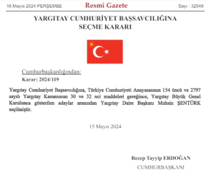 Kadircan GÜLER/ ANKARA, (DHA)- RESMİ Gazete’de yayımlanan karara göre Cumhurbaşkanı Recep Tayyip Erdoğan'ın imzası ile .Cumhurbaşkanı Recep Tayyip Erdoğan imzasıyla Resmi Gazete’de yayımlanan kararda, Yargıtay Cumhuriyet Başsavcılığı'na, Türkiye Cumhuriyeti Anayasasının 154 üncü ve 2797 sayılı Yargıtay Kanununun 30 ve 32’nci maddeleri gereğince, Yargıtay Büyük Genel Kurulunca gösterilen adaylar arasından Yargıtay Daire Başkanı Muhsin Şentürk seçildi. MUHSİN ŞENTÜRK KİMDİRMuhsin Şentürk, 1968 yılında Ankara'da doğmuştur. İlk, orta ve lise eğitimini tamamladıktan sonra Ankara Üniversitesi Hukuk Fakültesi'ni kazandı. Mezuniyetinin ardından hakim adayı olarak mesleğe başlayan Şentürk, çeşitli görevlerin ardından Kars Susuz ve Sivas Koyulhisar Cumhuriyet Savcılığı görevleri yerine getirmiştir. Yargıtay üyeliğine 2012'de seçilen Muhsin Şentürk, evli ve iki çocuk babasıdır. (DHA)