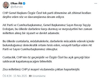 ANKARA, (DHA)- AK Parti Genel Başkan Vekili Efkan Ala, "Cuntacılık, CHP'nin öz geçmişidir ve Özgür Özel bu açık gerçeği bize saldırarak kapatamayacağını bilmelidir. Zira milletimiz CHP'yi maşeri vicdanında çoktan hapsetmiştir" dedi. AK Parti'li Efkan Ala, sosyal medya hesabından yaptığı açıklamada, "CHP Genel Başkanı Özgür Özel tek parti dönemine ait zihinsel kodları deşifre eden söz ve davranışlarına devam ediyor. AK Parti ve Cumhurbaşkanımız, Genel Başkanımız Sayın Recep Tayyip Erdoğan, bu ülkede darbelere karşı durmuş ve meşruiyetini her zaman milletten almış bir siyaset ve devlet adamıdır. Bu ülkede cuntalarla, müdahalelerle, darbelerle mücadele ederek içinde bulunduğumuz demokratik ortamı tesis eden, vesayeti tasfiye eden AK Parti ve Sayın Cumhurbaşkanımız olmuştur. Cuntacılık, CHP'nin öz geçmişidir ve Özgür Özel bu açık gerçeği bize saldırarak kapatamayacağını bilmelidir. Zira milletimiz CHP'yi maşeri vicdanında çoktan hapsetmiştir" dedi. (DHA)