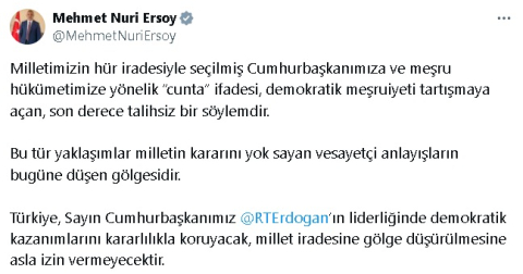 ANKARA, (DHA)- KÜLTÜR ve Turizm Bakanı Mehmet Nuri Ersoy, "Milletimizin hür iradesiyle seçilmiş Cumhurbaşkanımıza ve meşru hükümetimize yönelik 'cunta' ifadesi, demokratik meşruiyeti tartışmaya açan, son derece talihsiz bir söylemdir" dedi.Bakan Ersoy, sosyal medya hesabı üzerinden yaptığı paylaşımda, "Milletimizin hür iradesiyle seçilmiş Cumhurbaşkanımıza ve meşru hükümetimize yönelik 'cunta' ifadesi, demokratik meşruiyeti tartışmaya açan, son derece talihsiz bir söylemdir. Bu tür yaklaşımlar milletin kararını yok sayan vesayetçi anlayışların bugüne düşen gölgesidir. Türkiye, Sayın Cumhurbaşkanımız Recep Tayyip Erdoğan’ın liderliğinde demokratik kazanımlarını kararlılıkla koruyacak, millet iradesine gölge düşürülmesine asla izin vermeyecektir" ifadelerini kullandı. (DHA)