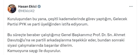 ANKARA, (DHA)- KONYA Milletvekili Hasan Ekici, Gelecek Partisi'nden istifa ettiğini duyurdu.Hasan Ekici, sosyal medya hesabından yaptığı açıklamada, "Kuruluşundan bu yana, çeşitli kademelerinde görev yaptığım, Gelecek Partisi Parti Yönetim Kurulu (PYK) ve parti üyeliğinden istifa ediyorum. Bu süreçte beraber çalıştığımız Genel Başkanımız Prof. Dr. Sayın Ahmet Davutoğlu'na ve partili arkadaşlarıma teşekkür eder, bundan sonraki siyasi çalışmalarında başarılar dilerim. Kamuoyuna saygı ile duyurulur" dedi. (DHA)
