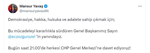 ANKARA, (DHA)- ANKARA Büyükşehir Belediye Başkanı Mansur Yavaş, CHP Genel Başkanı Özgür Özel'in yanında olduklarını belirterek, "Bugün saat 21.00'de herkesi CHP Genel Merkezi'ne davet ediyoruz" dedi.Mansur Yavaş, sosyal medya hesabından yaptığı açıklamada, "Demokrasiye, hakka, hukuka ve adalete sahip çıkmak için; bu mücadeleyi kararlılıkla sürdüren Genel Başkanımız Sayın Özgür Özel'in yanındayız. Bugün saat 21.00'de herkesi CHP Genel Merkezi'ne davet ediyoruz" ifadelerini kullandı. (DHA)